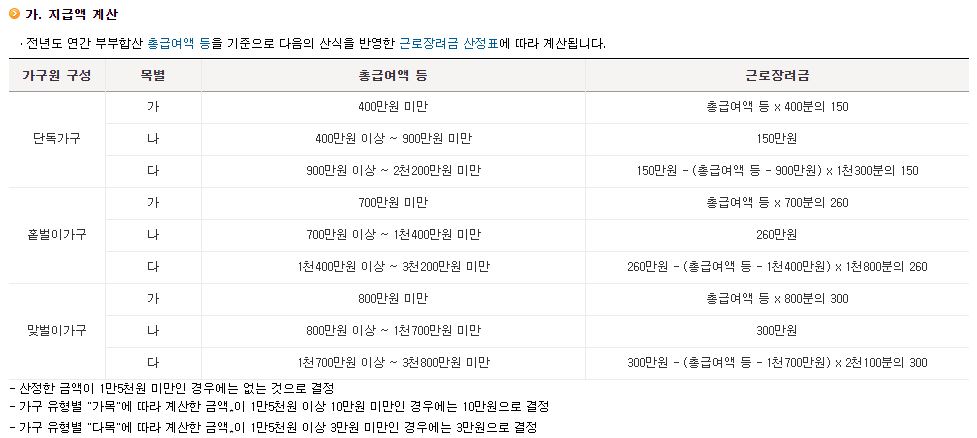 이제 이런 요건을 모두 만족시켜서 근로장려금 신청자격을 만족시키신 분들은 신청을 진행하시면 되는데요, 그 전에 얼마를 받을 수 있는지도 미리 따져보면 좋겠죠. 본인이 받을 수 있는 근로장려금 지급액 계산 방법은 아래와 같습니다.