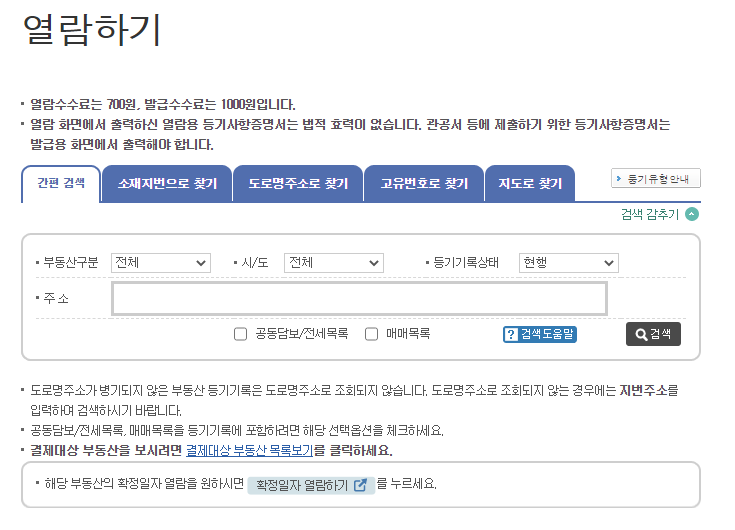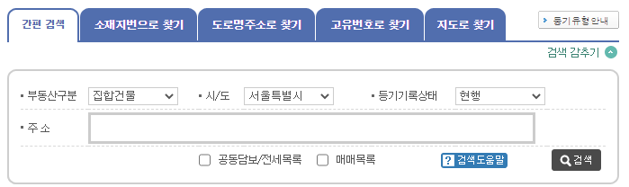 등기부 등본 검색을 위해서는 주소를 치고 검색을 하면 되는데요, 검색 방법은 간편 검색, 소재지번으로 찾기, 도로명주소로 찾기, 고유번호로 찾기, 지도로 찾기, 이렇게 총 다섯가지 방법이 있어요. 간편 검색을 통해 대체적으로 조회가 가능하실텐데, 가끔가다 검색이 잘 되지 않는 경우도 있더라구요. 그럴 때는 소재지번으로 찾기나 도로명주소로 찾기를 이용하시면 될 것 같아요.