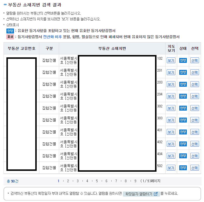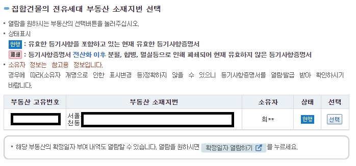 그러면 해당 부동산의 소유자 이름의 성 까지 표시되어 나타날 거에요. 상태가 현행이면 유효한 등기사항증명서이고 폐쇄 라고 되어있으면 현재 유효하지 않은 등기사항증명서 입니다. 다시 한번 부동산 소재 지번과 소유자를 확인한 뒤 선택 버튼을 눌러주세요.