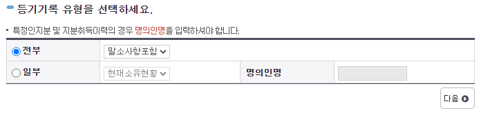 다음으로는 등기기록 유형을 선택하게 되는데요. 일반 등기부등본의 모든 사항을 나타내기를 원하신다면 전부를 포함하시면 됩니다. 이 때 이미 말소된 내용까지 모두 확인하고 싶으시면 말소사항포함을 선택하시면 되고, 이미 말소된 내용은 아예 표시하지 않고 현 시점에 유효한 사항만 나타내기를 원하신다면 현재유효사항을 선택하시면 됩니다.