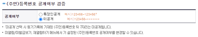 다음으로는 주민등록번호의 공개여부를 선택하게 되는데요, 일반적으로 타인 명의 부동산의 등기부등본을 발급받는 경우에는 미공개로 발급을 받게 됩니다. 특정인공개를 선택하시면 그 특정인의 주민등록번호를 입력해야 합니다.