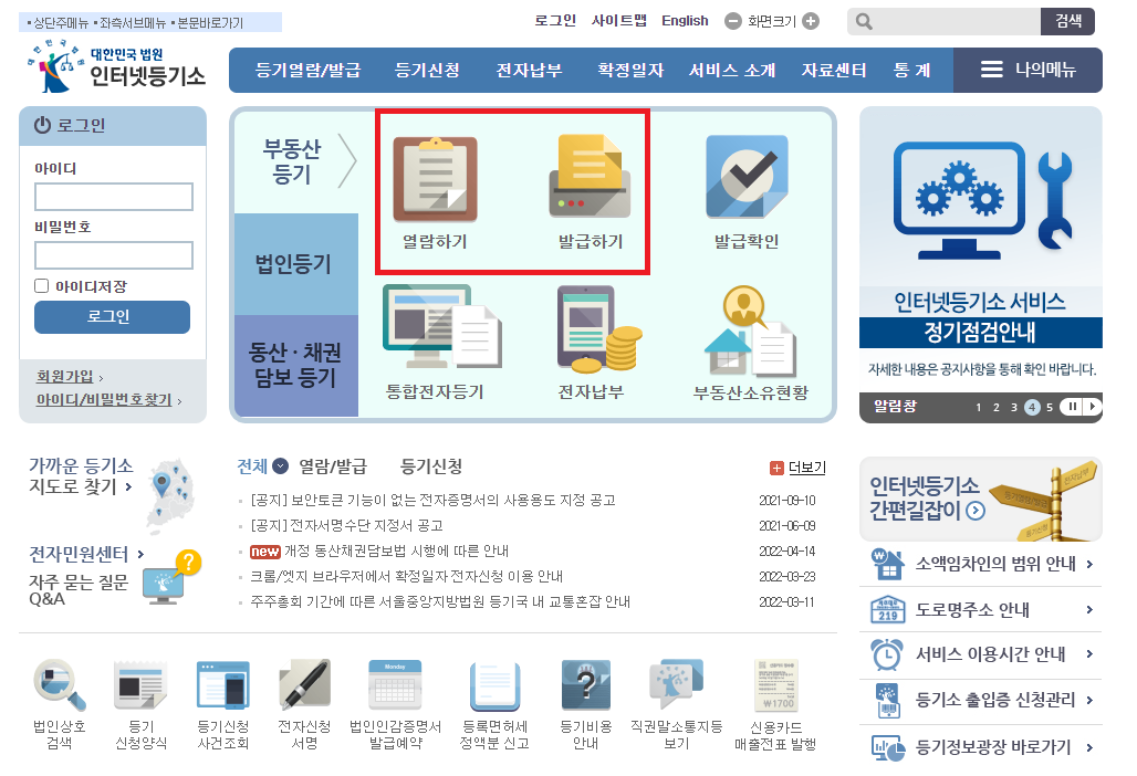 그렇게 인터넷 등기소 홈페이지에 접속하게 되면 첫 화면에 가운데에 크게 부동산 등기 열람하기 메뉴와 발급하기 메뉴를 확인하실 수 있을거에요. 열람하기 메뉴는 말 그대로 확인만 하는 내용이고 발급하기는 정식 서류로 발급받는 것 입니다. 목적에 맞게 메뉴를 선택 해 주세요.