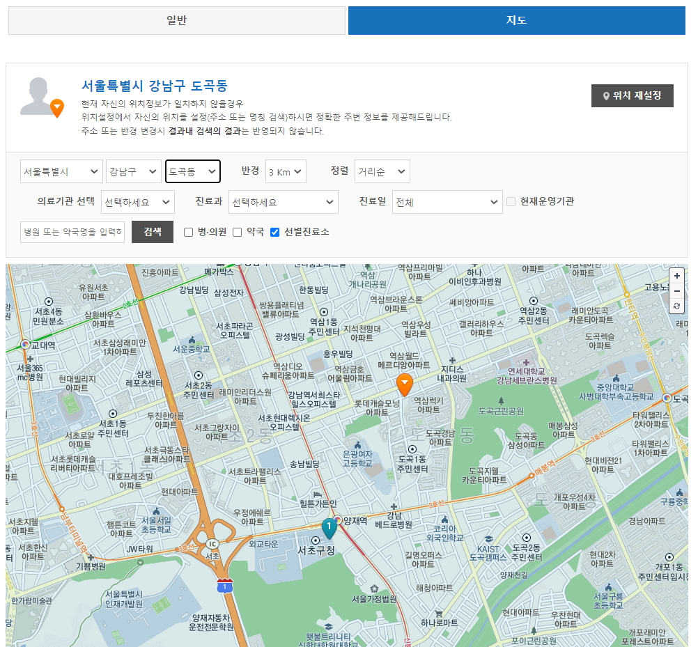지도를 통해 보시는 것도 가능해요. 상단에 보시면 일반/지도 중 선택하실 수 있게 되어있는데요, 지도를 클릭하시고 검색하시면 위 이미지와 같이 지도로 위치를 확인하시면서 선별진료소 조회가 가능합니다.