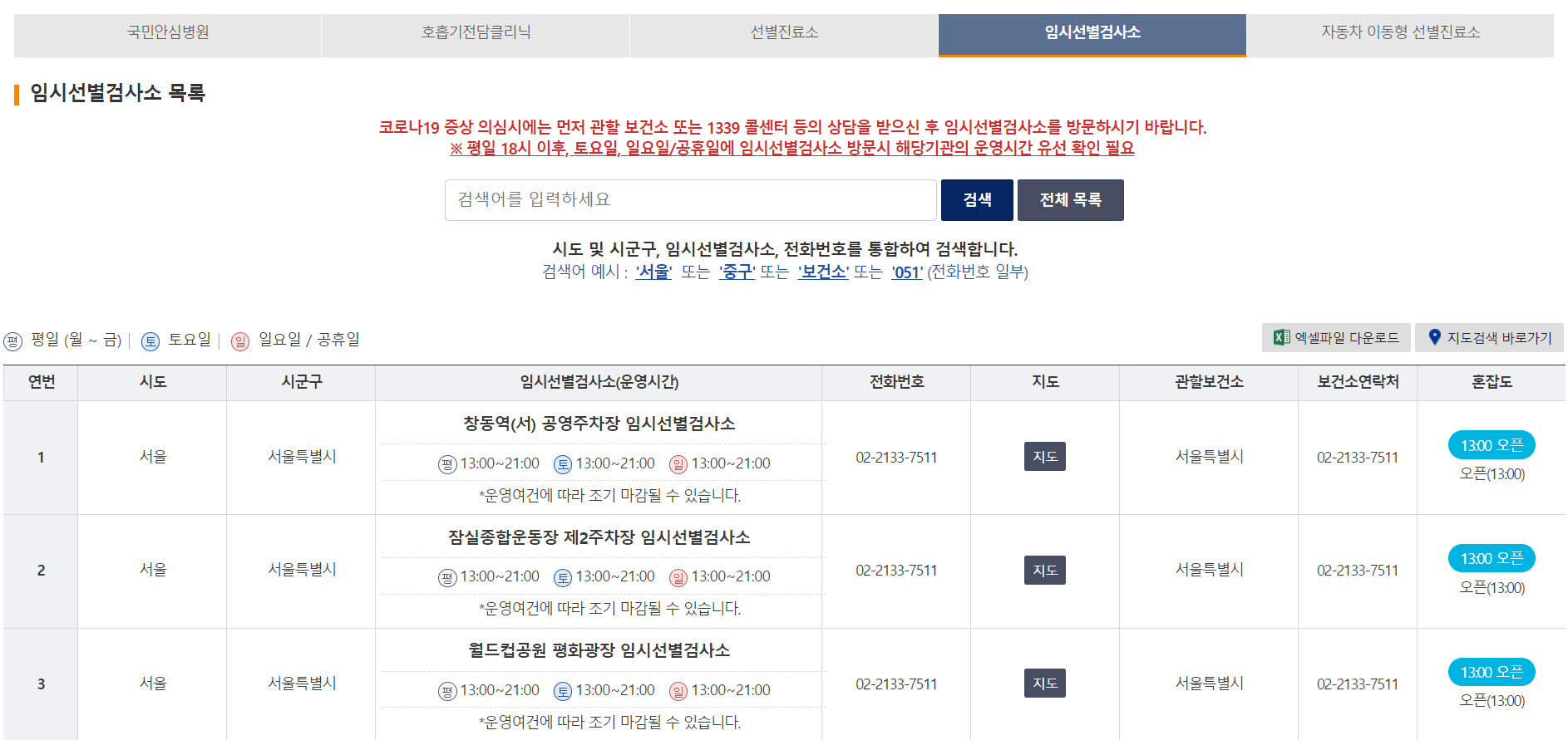 위의 이미지에서 보실 수 있듯 임시선별검사소의 운영시간과 전화번호, 위치, 혼잡도까지도 확인이 가능합니다. 공휴일의 경우 오후 1시 이후부터 오픈을 하는 곳이 많다는 점 참고하시면 좋을 것 같네요.