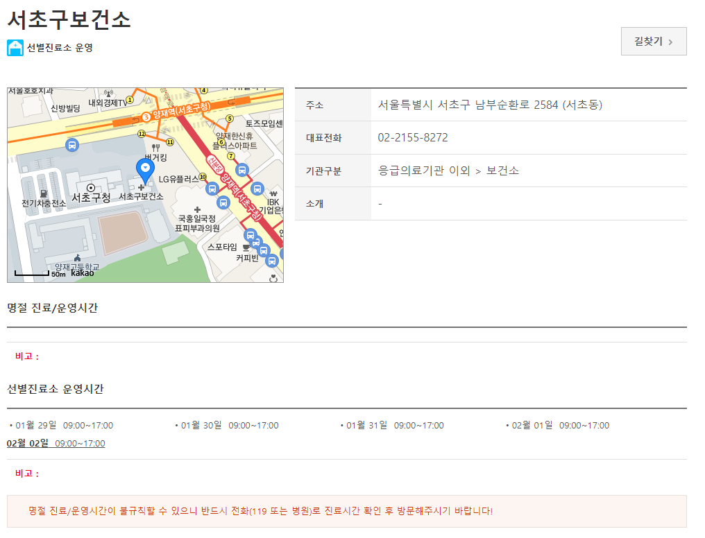 그렇게 검색을 하시면 해당 구에 있는 모든 선별진료소 운영 현황을 확인하실 수 있어요. 특히 명절 기간에 원활하게 이용하실 수 있도록 날짜별로 운영시간이 상세하게 잘 나와있으니까요, 날짜별 운영시간 확인하시고 방문하시면 될 것 같습니다.