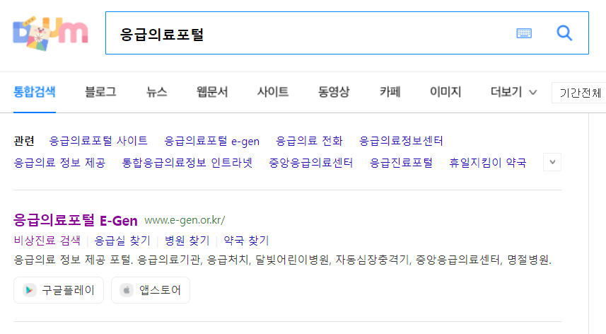 응급의료포털 홈페이지는 포털 사이트에 응급의료포털 이라고 검색하시면 위의 이미지와 같이 최상단에서 확인하실 수 있는 사이트입니다. 보건복지부에서 운영하는 사이트이기때문에 믿고 이용하시면 돼요.