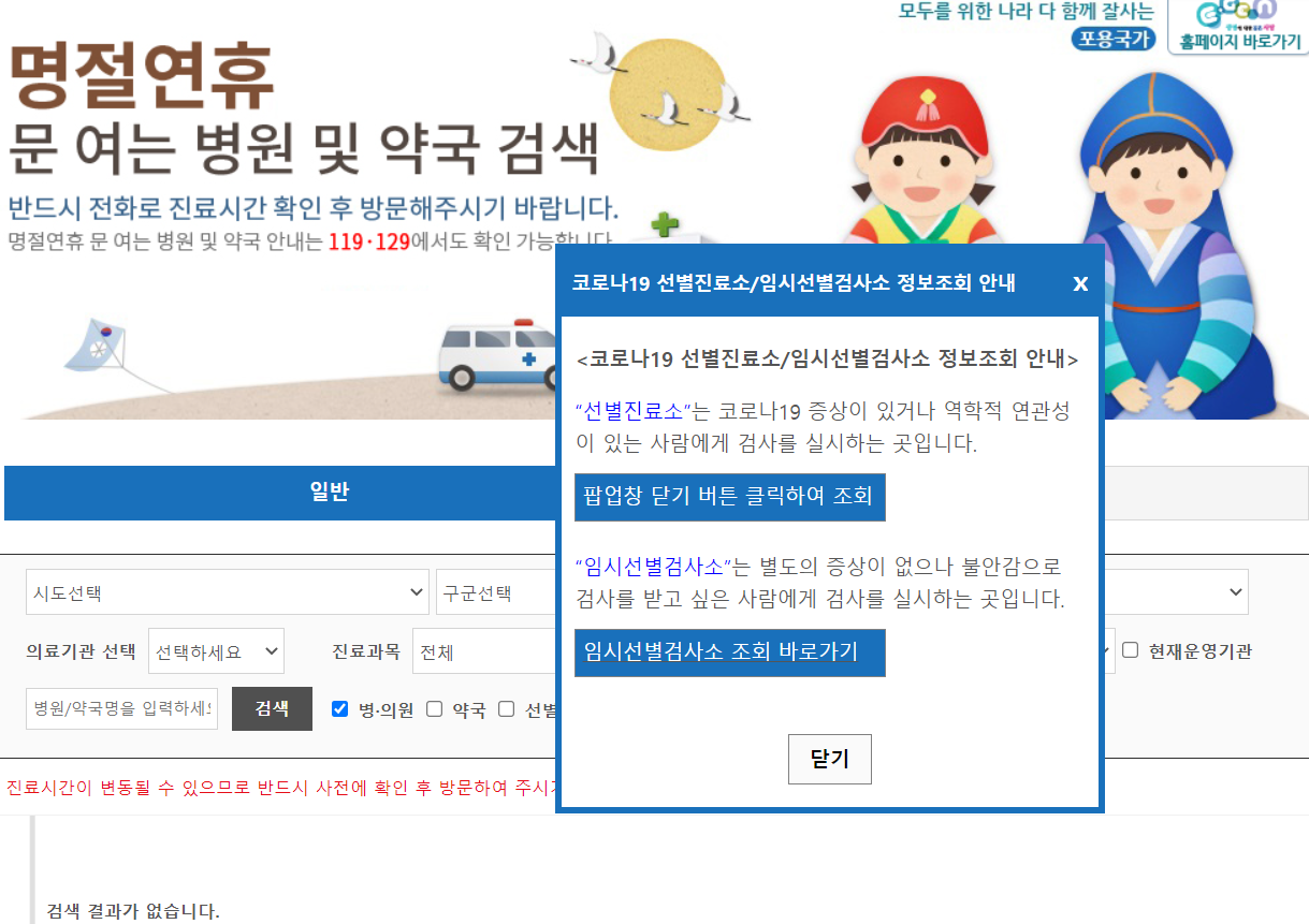 현재 명절 연휴라 응급의료포털 메인 화면이 조금 바뀌었어요. 홈페이지에 접속하시면 팝업창이 하나 뜨는 것을 확인하실 수 있는데요, 선별진료소 또는 임시선별검사소 정보 조회 안내가 되어있는 팝업창이에요. 만약 선별진료소 운영시간이 궁금하시면 닫기 버튼을 누르시면 되고 임시선별검사소 운영시간이 궁금하시면 임시선별검사소 조회 바로가기 버튼을 누르시면 되는데요, 일단 선별진료소 운영 조회 먼저 해볼게요.