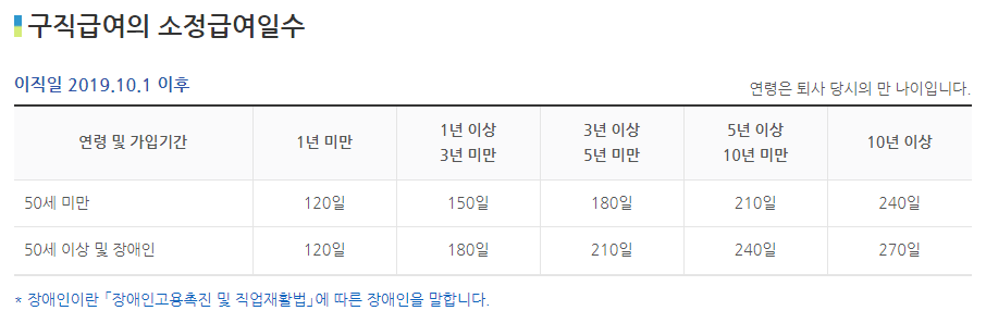 여기서 말하는 소정급여일수는 아래와 같습니다. 퇴사 당시의 만 나이와 고용보험 가입 기간에 따라 구직급여를 지급 받을 수 있는 일수가 달라집니다.