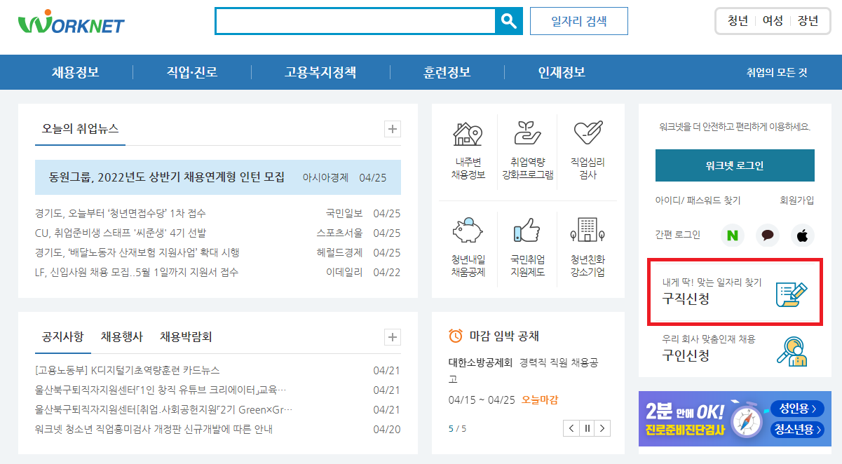 워크넷 사이트에 접속하시면 우측 하단에 구직신청 이라는 배너를 발견하실 수 있을거에요. 해당 배너를 클릭하고 들어가셔서 구직신청을 하시면 되는데요, 워크넷 홈페이지에 회원가입이 되어 있어야 진행 가능한 내용이니 제일 먼저 회원가입을 하고 진행 해 주세요.