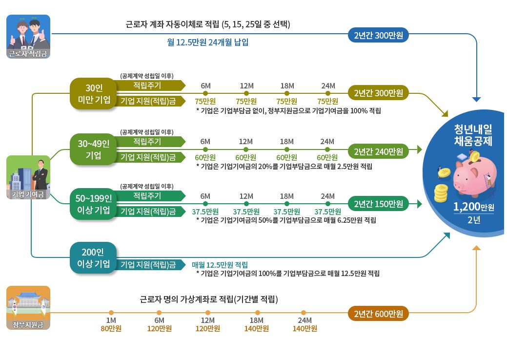 예를 들어 30인 미만 기업의 경우 기업은 한푼도 낼 필요가 없어요. 정부가 제공하는 기업지원금으로 2년동안 300만원을 지원받아 적립하게 됩니다.