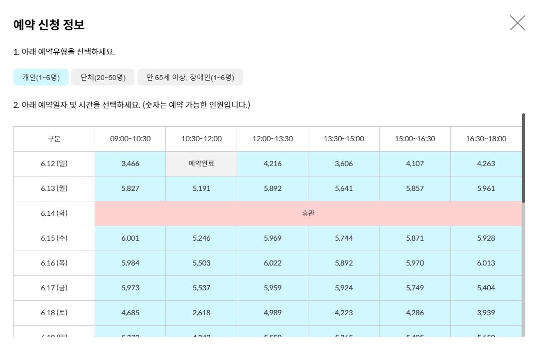 현재 신청 가능 인원수는 6명인데요, 다자녀 가족은 6명이 초과되더라도 입장할 때 가족관계증명서나 주민등록등본을 보여주셔서 가족이라는 것을 증빙하시면 인원에 제한 없이 입장 가능하다고 합니다.
