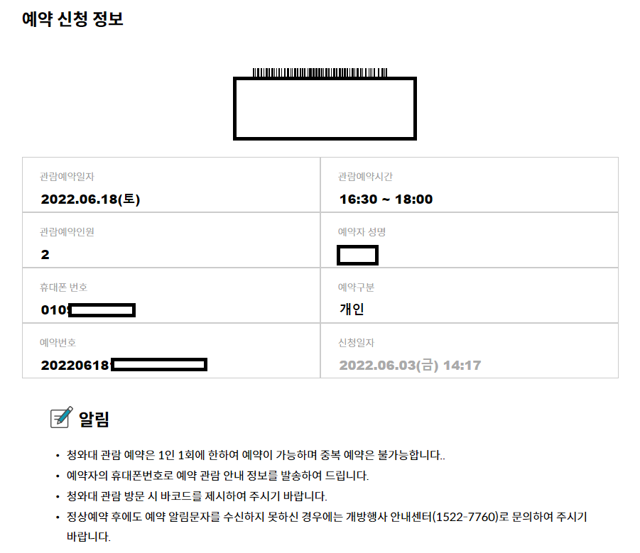그리고 마지막으로 약관에 동의하시고 관람 신청 등록 버튼까지 눌러주시면 청와대 관람 신청 완료입니다. 예약 신청 정보가 뜨면 정상적으로 청와대 관람신청이 완료되었다는 거구요. 예약 신청 완료와 동시에 기입한 휴대폰 번호로도 문자가 바로 옵니다. 해당 문자에서 링크를 클릭하고 들어가면 바코드가 뜨게 되어서 바코드를 보여주시고 입장하면 됩니다.
