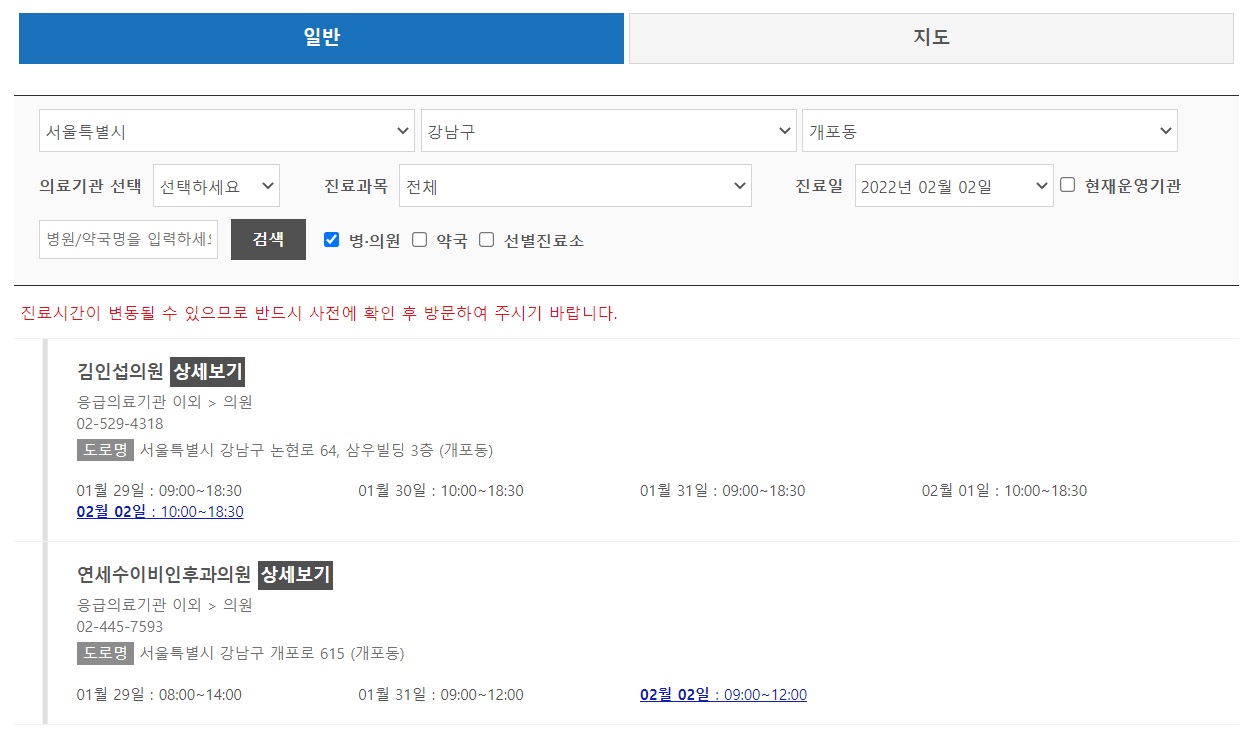이 사이트가 보건복지부에서 운영하는 사이트이기때문에 믿을만하기는 하지만 정보가 잘못 된 경우도 있을 수 있겠죠. 의료기관의 전화번호도 같이 나와있으니 방문하시고자 하는 의료기관에 전화로 영업 여부를 확인하시고 방문하시는 것이 헛걸음을 방지하는 좋은 방법일 것 같습니다.