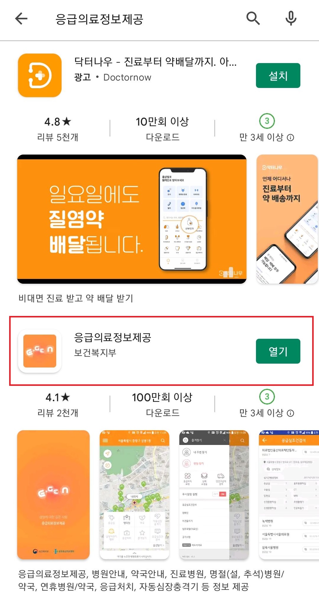 바로 응급의료정보 라는 어플인데요. 플레이스토어나 앱스토어에 응급의료정보 라고 검색하시면 찾으실 수 있을거에요. 그런데 플레이스토어 기준으로 검색을 했을 때 제일 위에 뜨지 않고 두번째로 뜨니까요, 이름을 정확히 확인하고 설치하시면 좋을 것 같아요. 응급의료정보 어플 입니다.