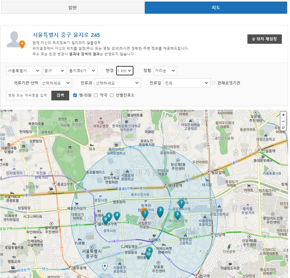 지도로도 검색이 가능해요. 일반/지도로 선택할 수 있게 되어있는데 기본은 일반으로 설정되어 있을거에요. 여기서 지도를 선택 해 주시면 위와 같이 지도를 기준으로 병원, 약국 등을 검색할 수 있게 나옵니다. 역시 지역 설정을 하시고 검색버튼만 눌러주시면 돼요. 위에 이미지에서 숫자와 같이 나와있는 아이콘들이 의료기관을 나타내는거에요. 각 아이콘을 클릭하시면 해당 의료기관 정보를 좀 더 자세히 확인하실 수 있습니다.