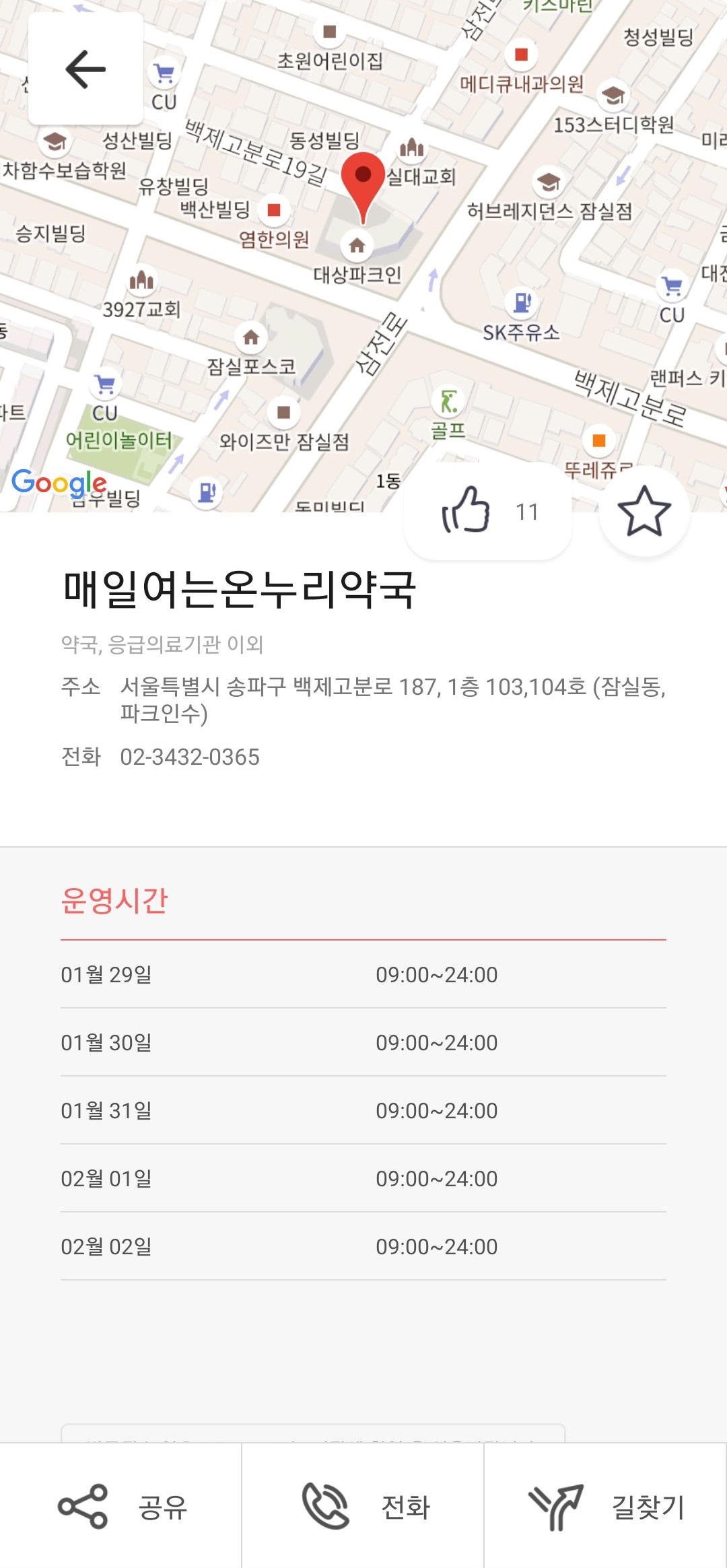 그러면 해당 지역에 위치한 병원 또는 약국 등이 뜨게 되는데요, 위에서도 보실 수 있듯이 특히 이번 설 연휴에는 날짜별로 운영시간이 어떻게 되는지 자세하게 나와있어요. 해당 영업시간을 참고하셔서 방문하시면 됩니다.